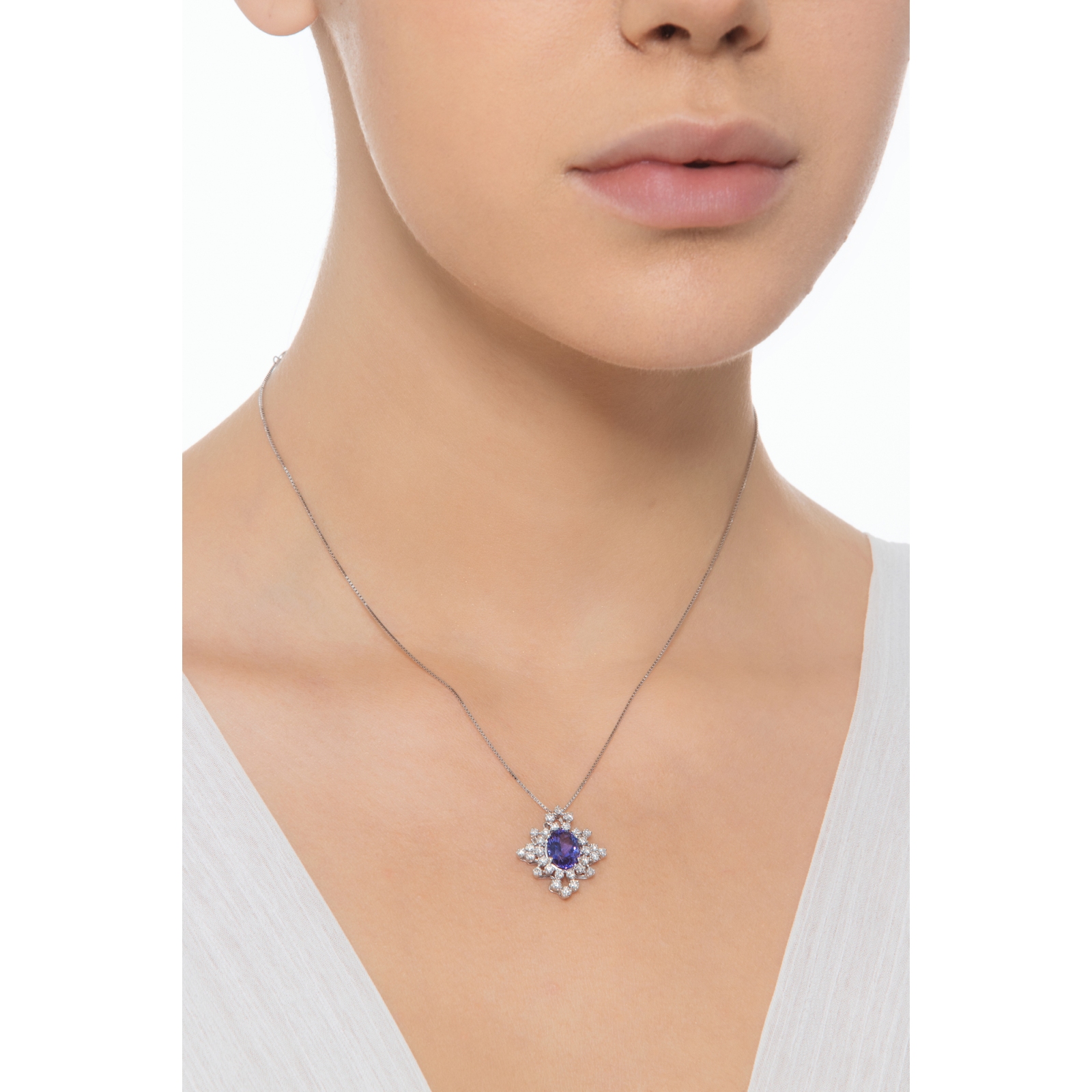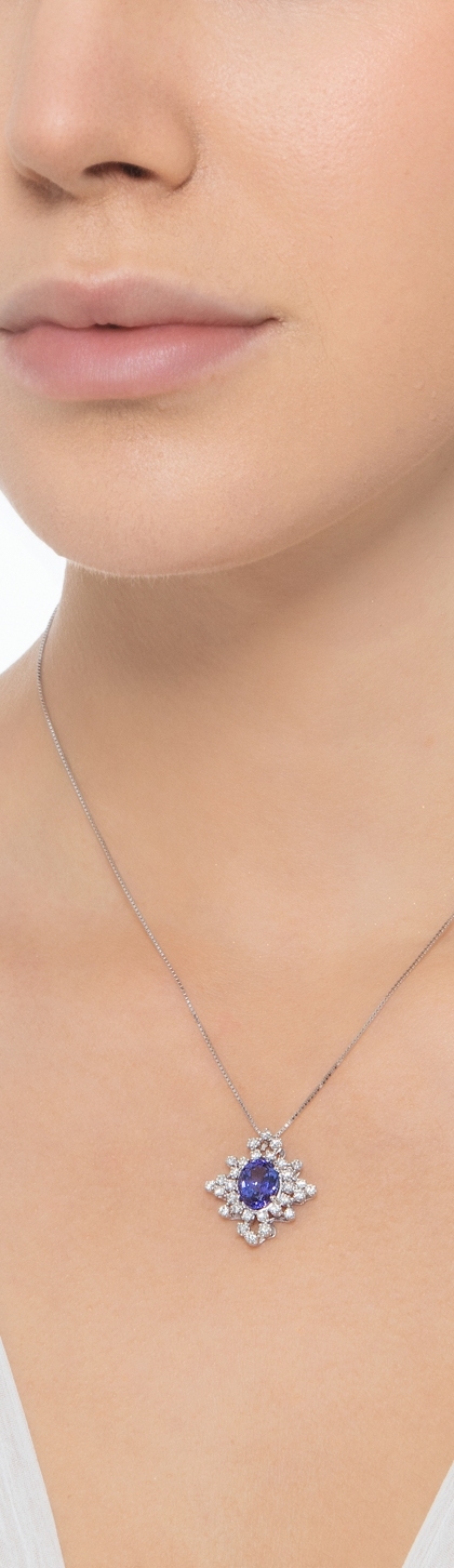 Collar Tanzanita Ovalada y Diamantes Halo Oro Blanco 18k