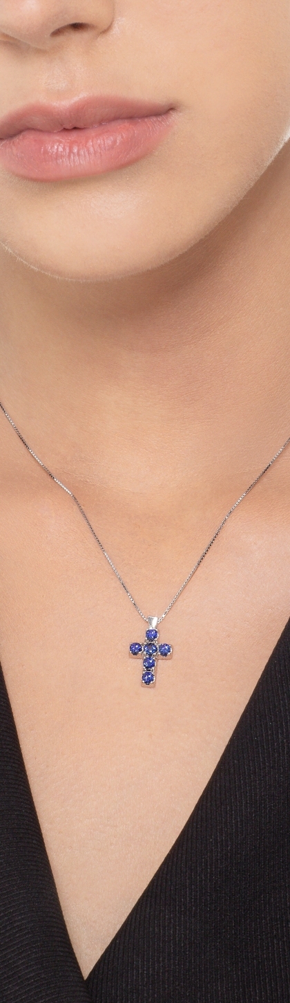 Collar con colgante cruz oro blanco 18 quilates con zafiros azules