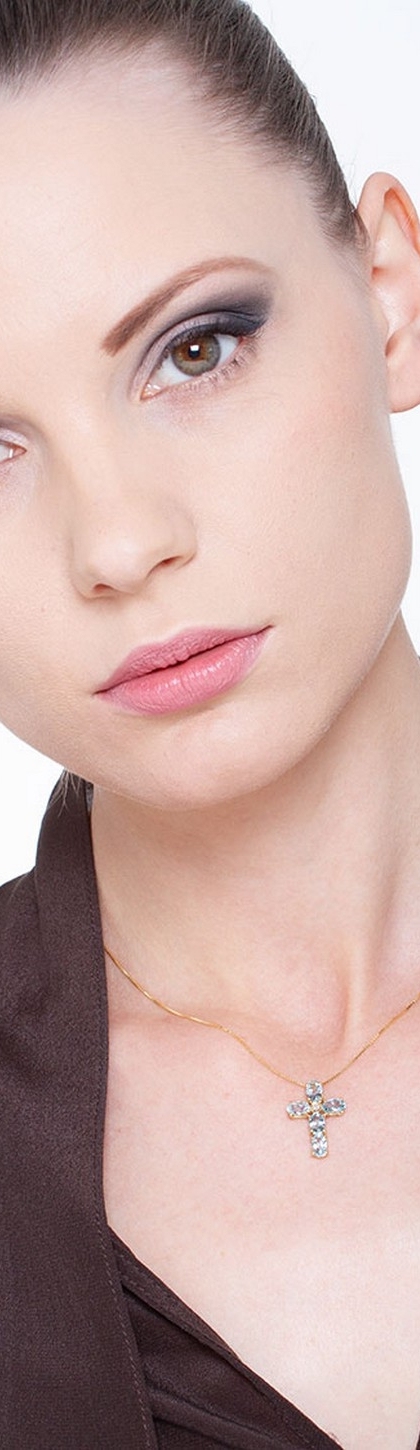 Collar en oro amarillo 18k con cruz con aguamarinas y diamante