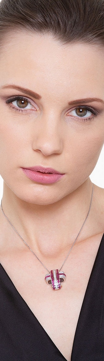 Collar en oro blanco 18k con cruz abombada de diamantes y rubíes