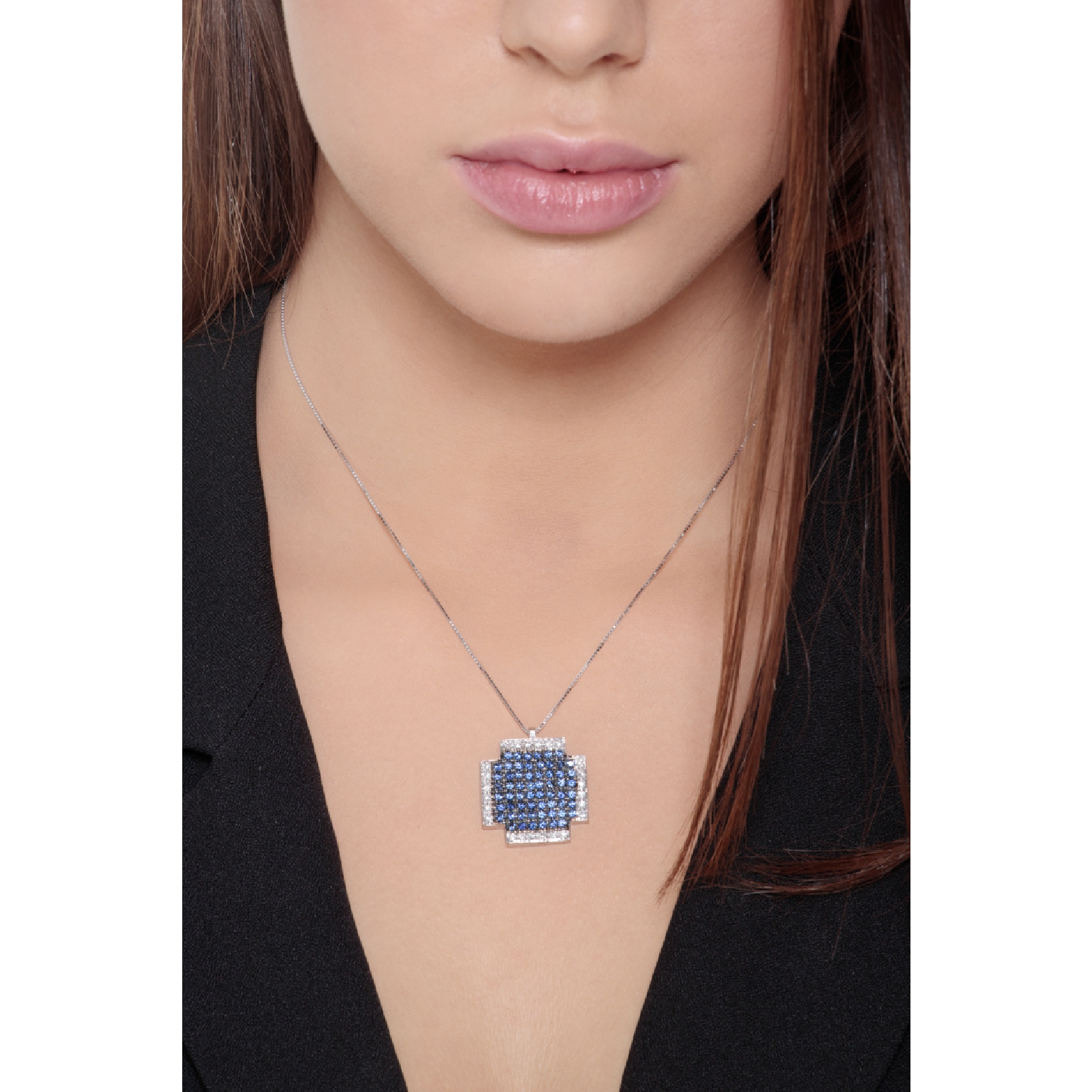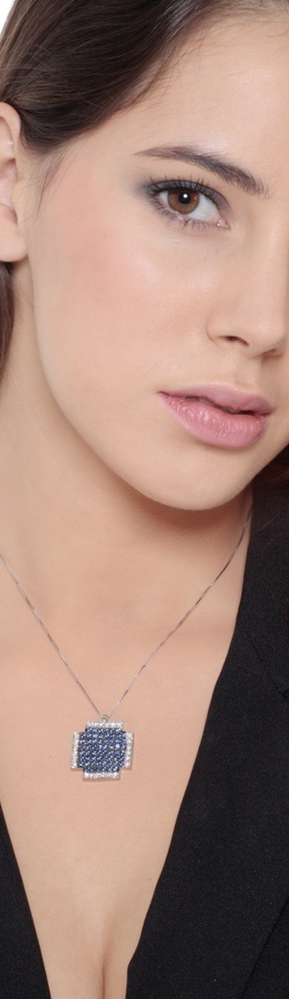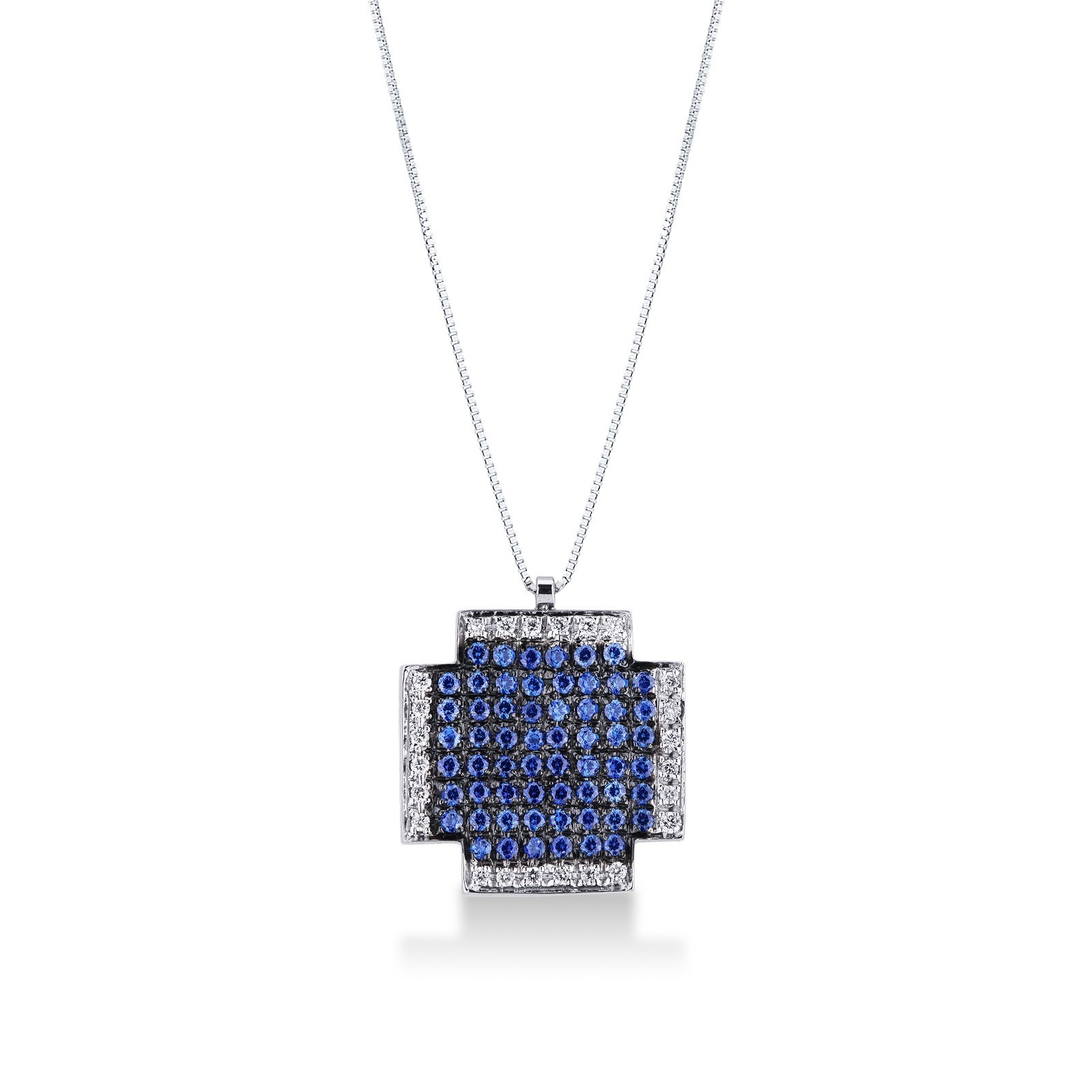 Collar en oro blanco 18k con cruz cuadrada con zafiros y diamantes