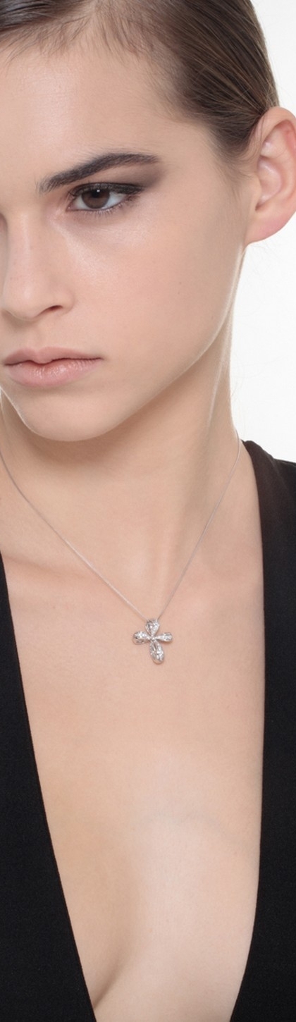 Collar en oro blanco 18k con cruz elaborada y diamantes brillantes