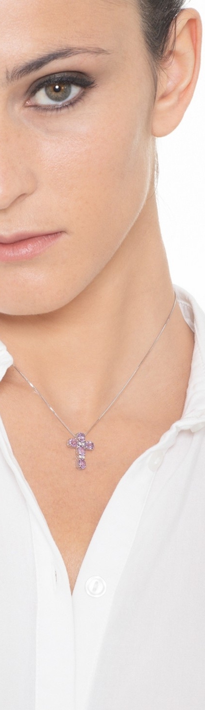 Collar en oro blanco de 18 quilates con cruz de amatistas y diamantes