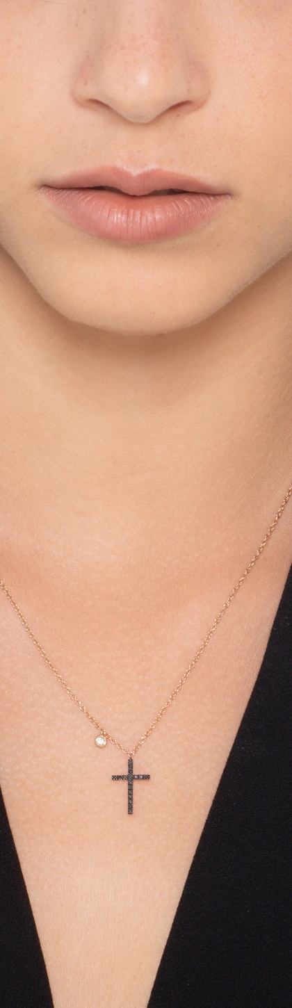 Collar en oro rosa de 18 quilates con cruz en diamantes negros y diamante
