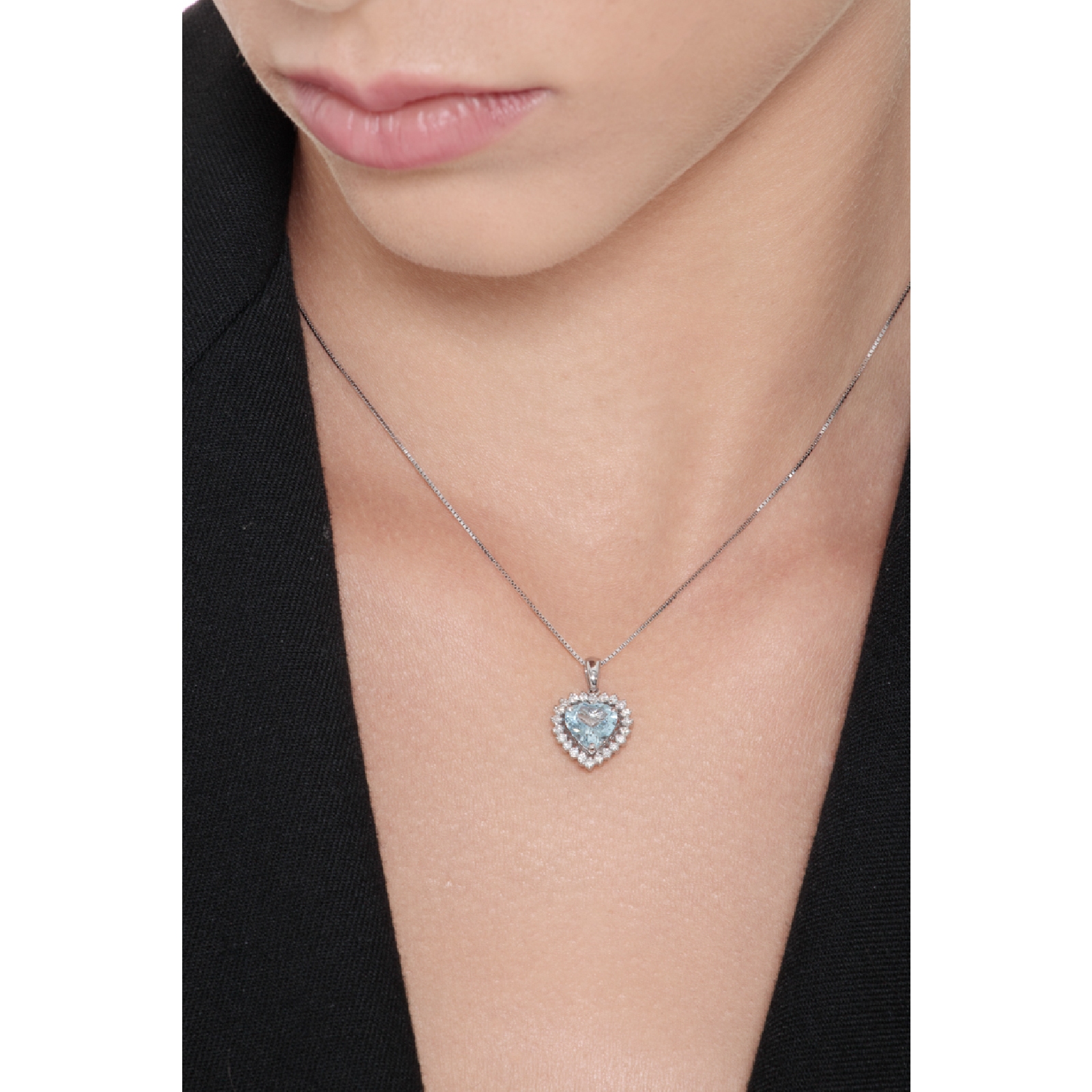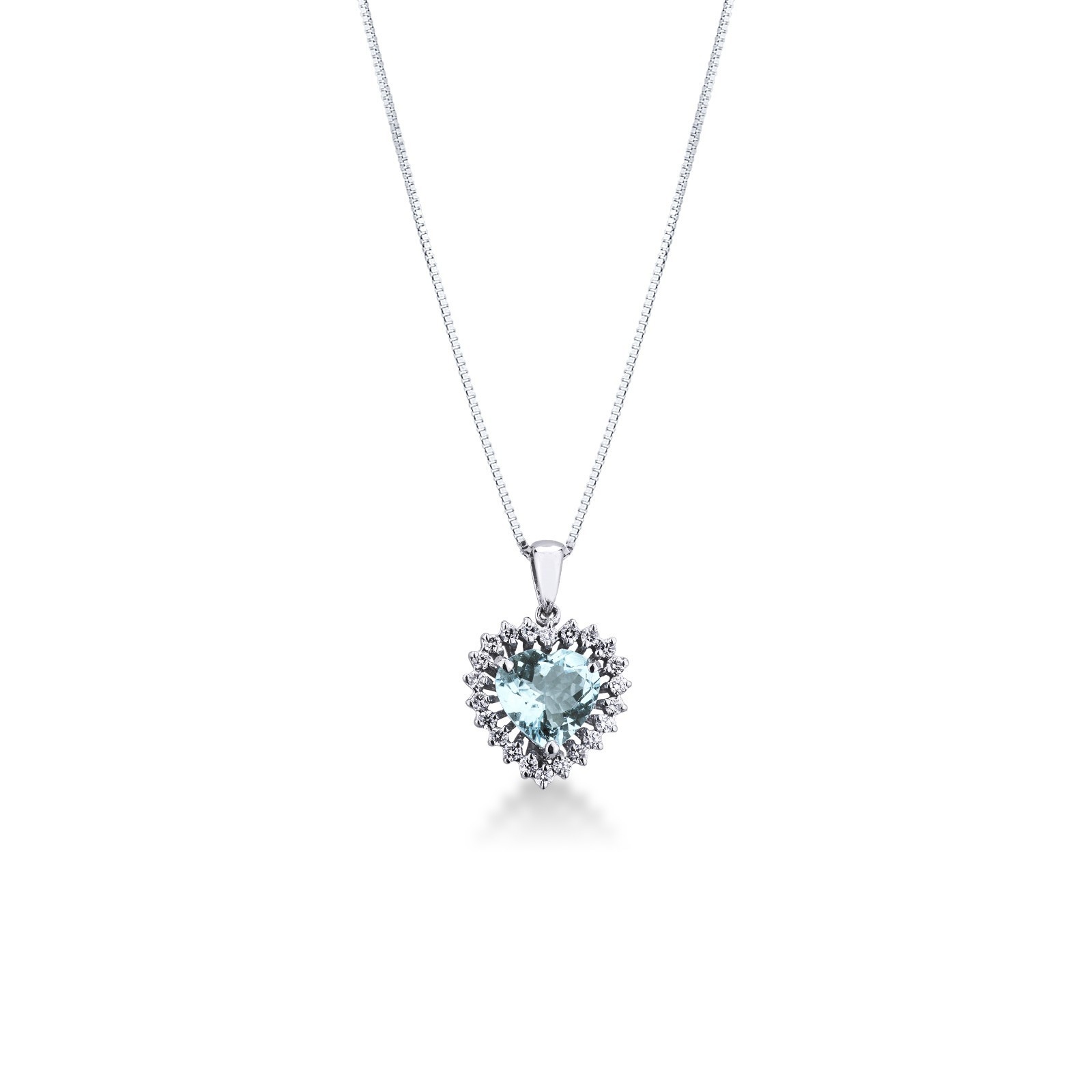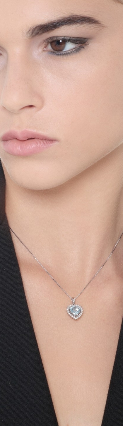 Cadena en oro blanco 18k con colgante corazón de aguamarina y diamantes