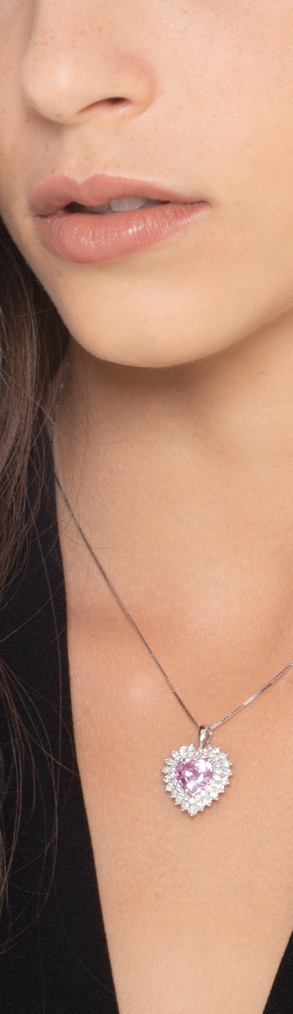 Colgante elegante en oro 18k con zafiro rosa en forma de corazón y diamantes