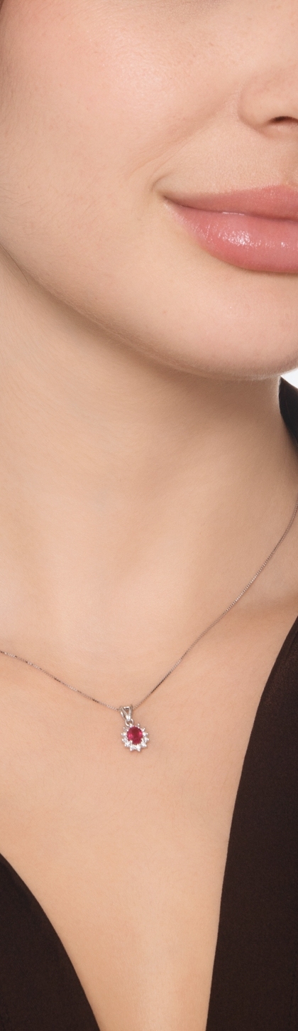 Elegante collar contorno en oro blanco 18k con rubí oval central de 5x4 mm y diamantes talla brillante, color H y pureza VS. Una joya sofisticada y luminosa para cualquier ocasión especial.