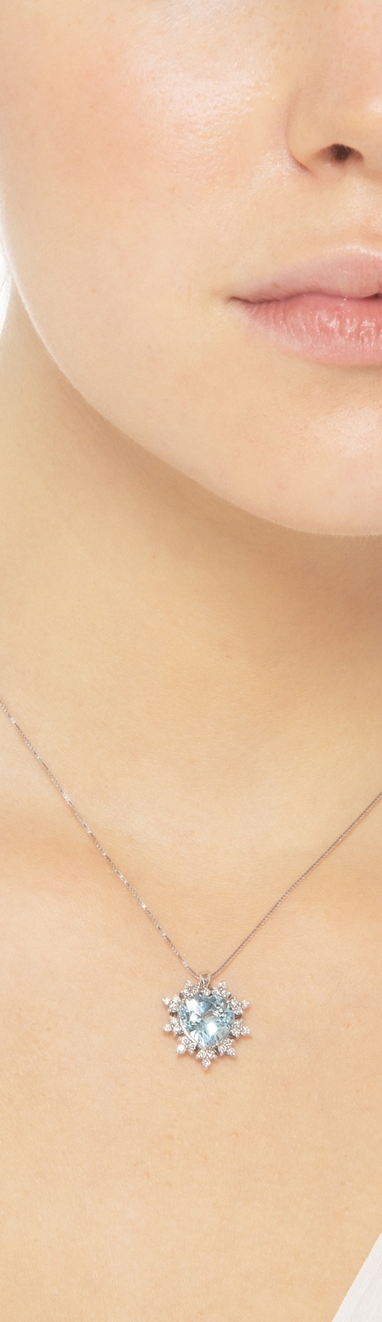 Collar elegante en oro blanco 18k, con un colgante en forma de flor cuyos pétalos están incrustados con diamantes corte brillante, color H y pureza VS. En el centro de la flor, resalta una aquamarina en corte corazón de aproximadamente 10x10 mm, que aporta un toque de luz y color. Una joya perfecta para una mujer que ama la elegancia y la belleza en los detalles.