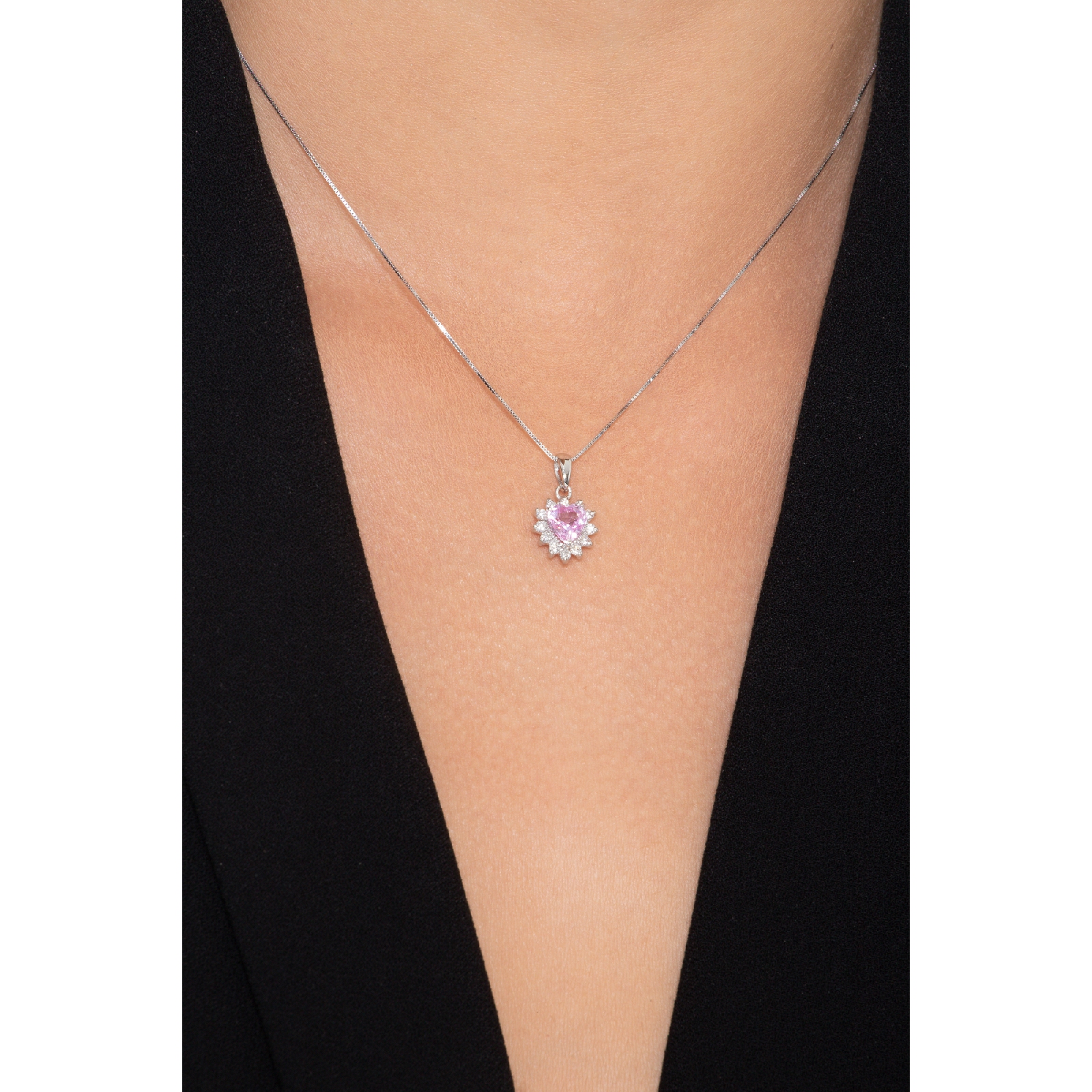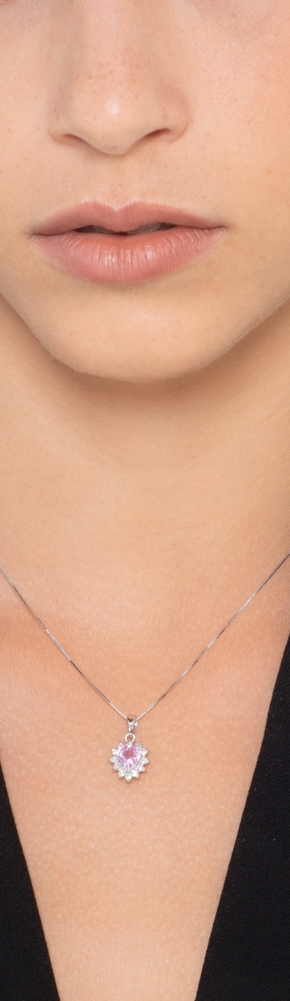 Collar en Oro Blanco 18k con Colgante Corazón, Zafiro Rosa y Diamantes