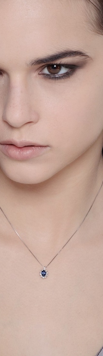 Collar halo oro blanco de 18K con un zafiro azul y diamantes