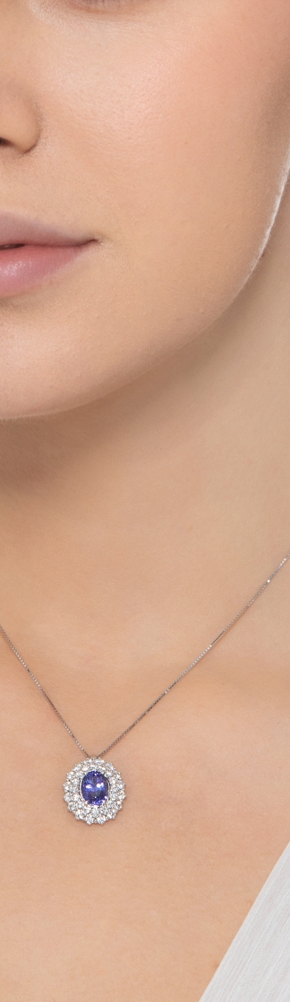 Collar oro blanco 18k con tanzanita ovalada y doble halo de diamantes