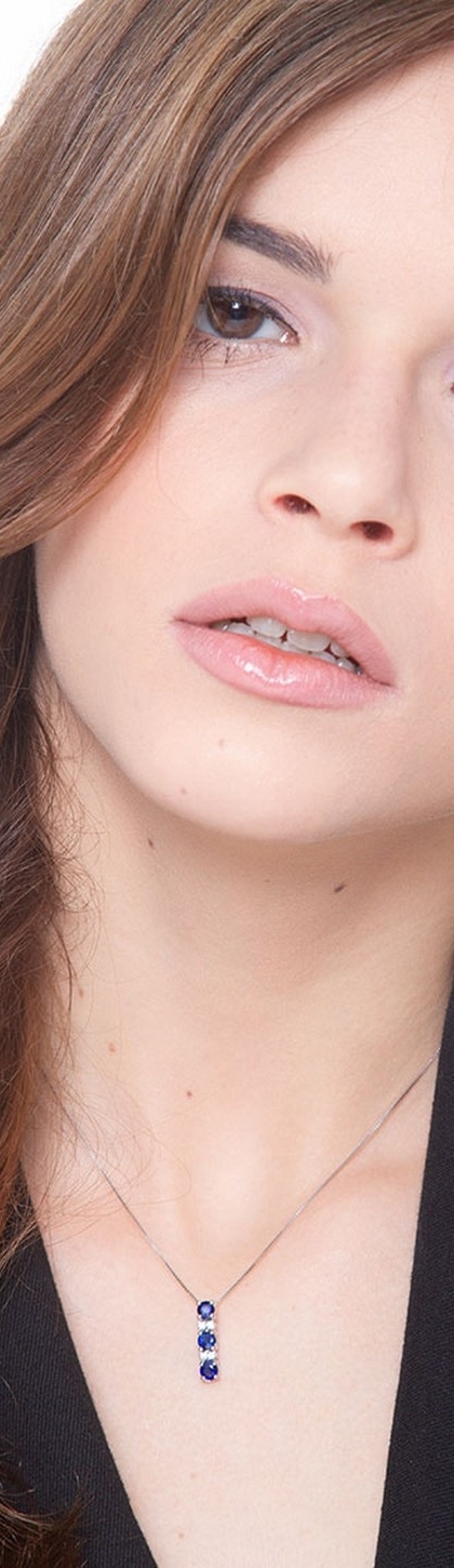 Collar en oro blanco 18 quilates con colgante trilogía en zafiros azules y diamantes