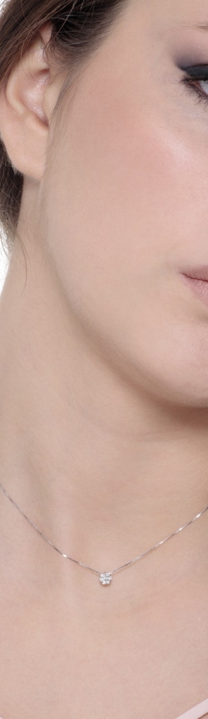 Collar Punto de Luz en oro blanco de 18 quilates, con diamantes engastados talla brillante de color H y pureza VS. Una joya luminosa y elegante, perfecta para cualquier ocasión.