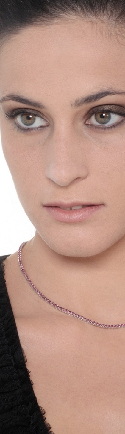 Collar tennis en oro blanco de 18 quilates con rubíes tallados en brillante. El quilataje puede variar según el tamaño del collar. Collar de líneas suaves que se adapta perfectamente a la forma del cuello, de una elaboración preciada y elegante.
