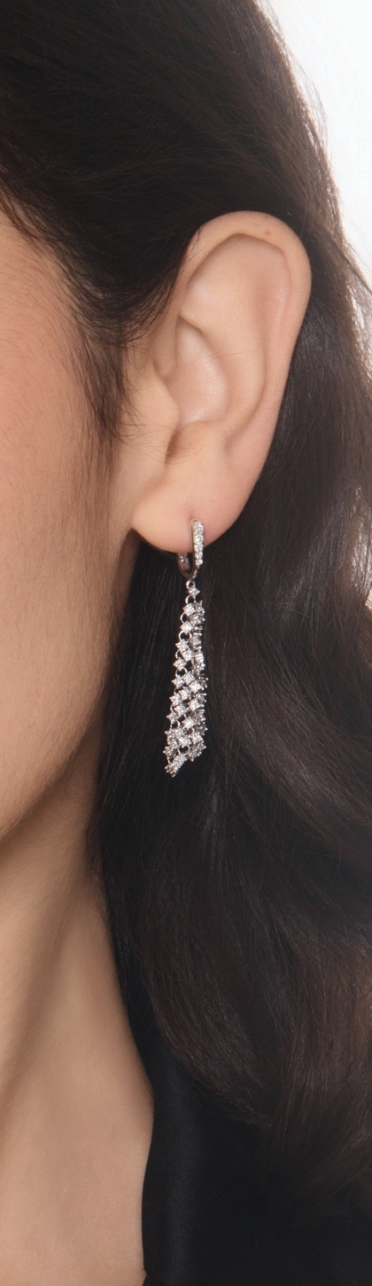 Pendientes colgantes en oro blanco de 18 quilates con estructura textil e incrustaciones de diamantes talla brillante, color H y pureza VS. Miden aproximadamente 5 cm y destacan por su estilo sofisticado y ligero.