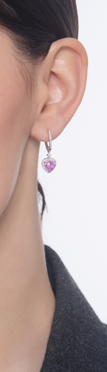 Pendientes en oro blanco con zafiro rosa en forma de corazón y diamantes