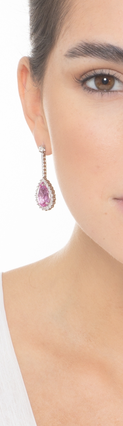 Pendientes halo en oro blanco 18k con zafiros rosas y diamantes brillantes