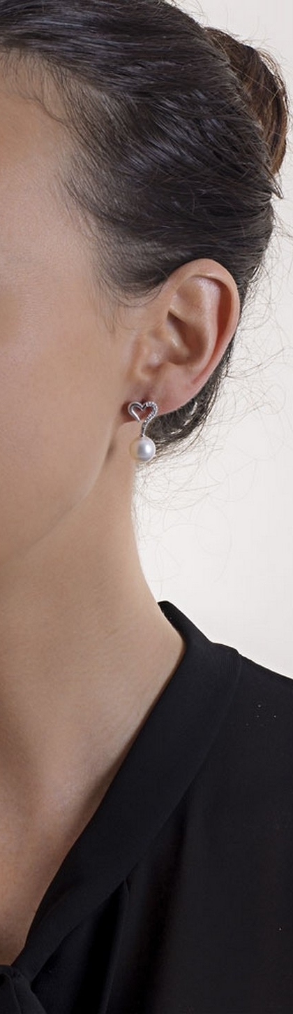 Pendientes corazón de oro blanco 18k con diamantes y una perla
