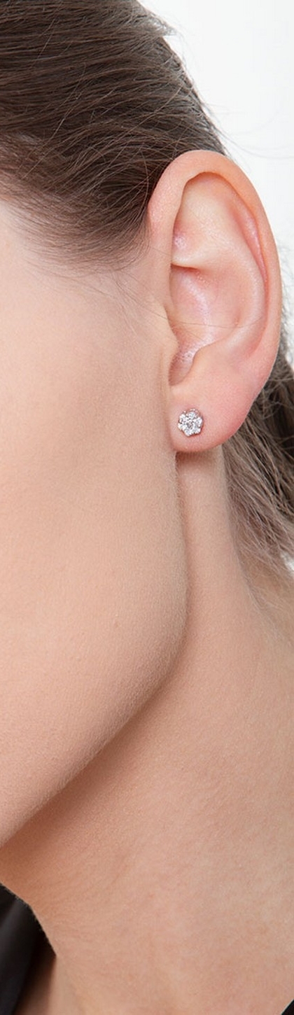 Pendientes modelo flor Illusión en oro blanco 18k con diamantes engastados en talla brillante, color H y pureza Vs. Miden aproximadamente 4,55x4,55 mm.