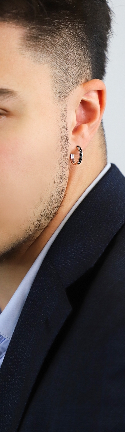 Pendiente mono aro en oro blanco 18k con diamantes negros y puntas brunidas