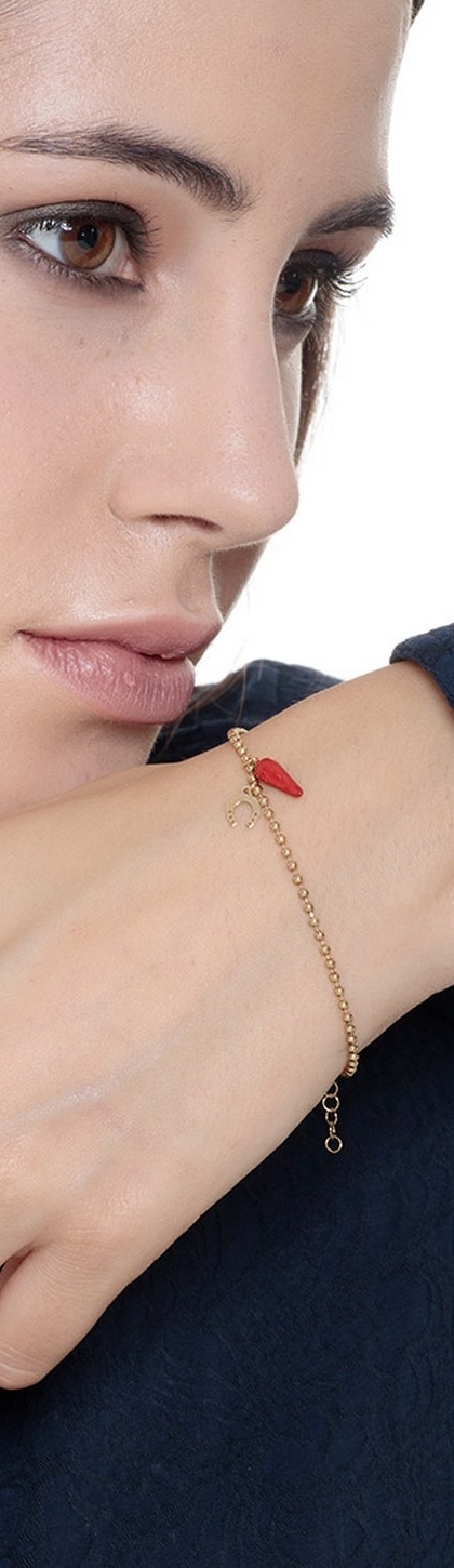 Pulsera oro 18K con herradura y cuerno rojo de la suerte