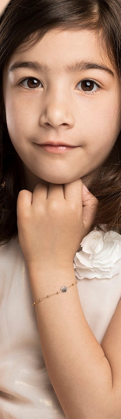 Pulsera oro amarillo y blanco 18k con motivo floral y bolas pulidas