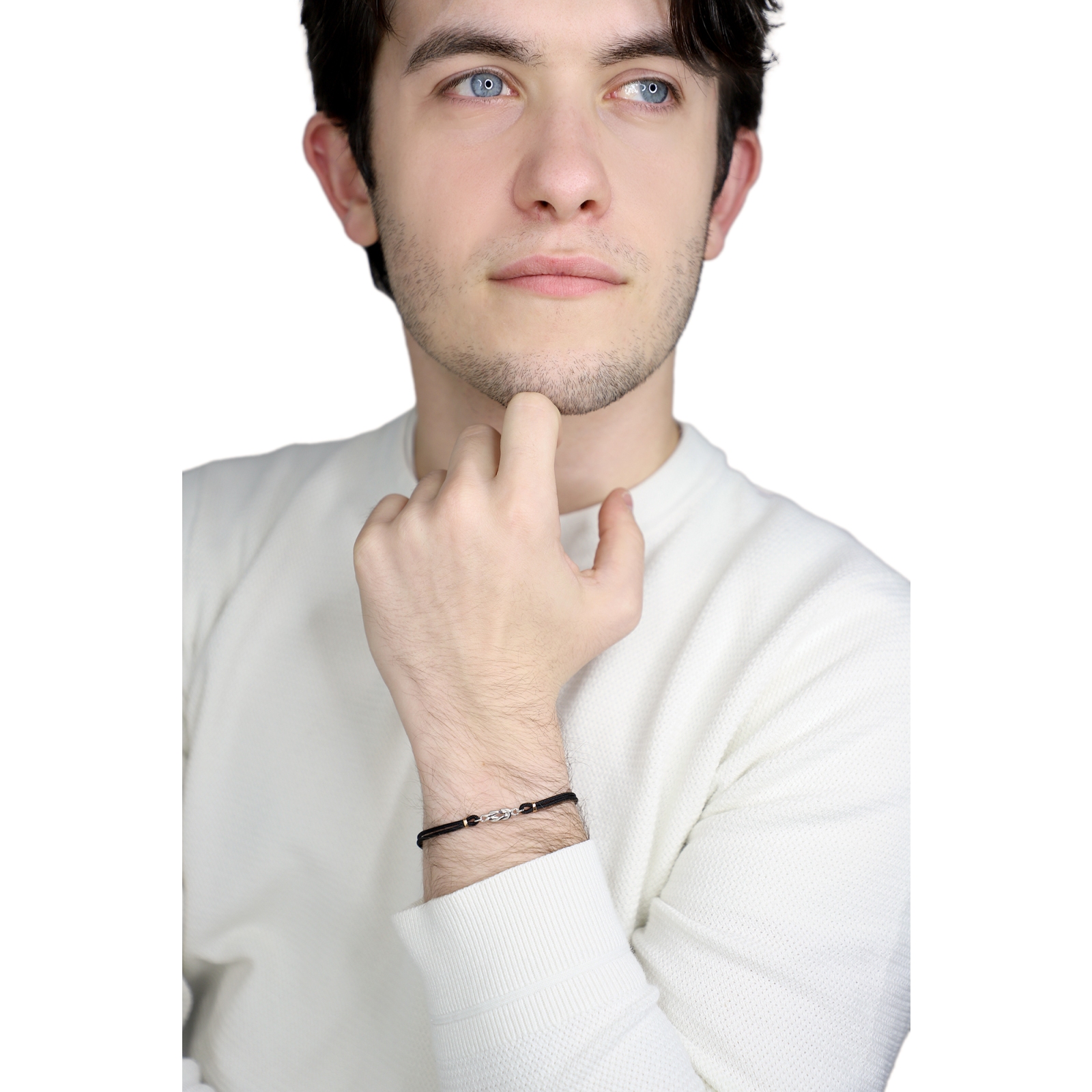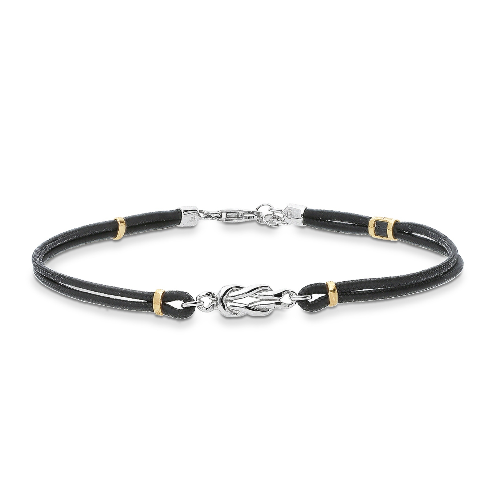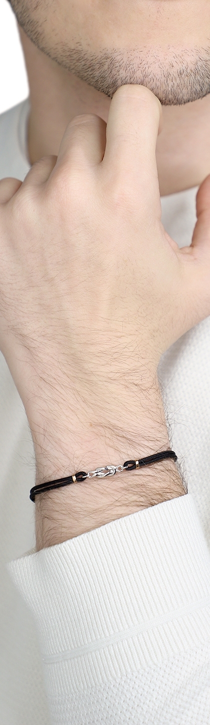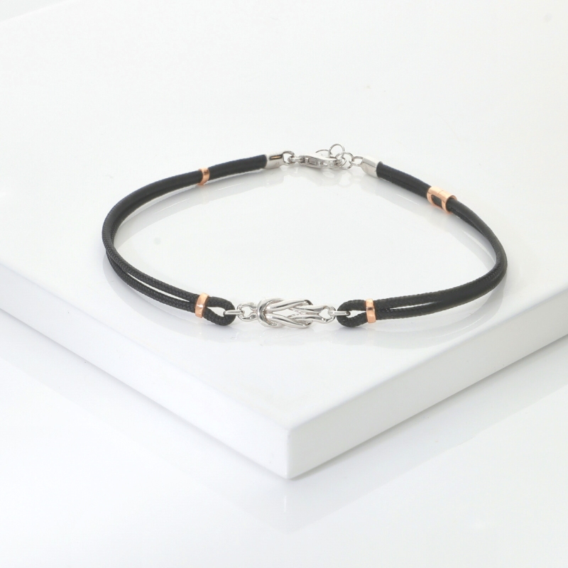 Pulsera tela negra con nudo en oro blanco y rosa 18k