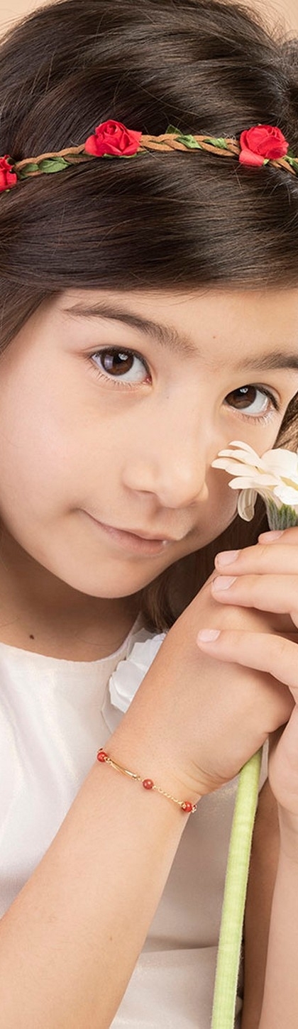 Pulsera de bebé en oro 18 quilates con seis coralitos y placa
