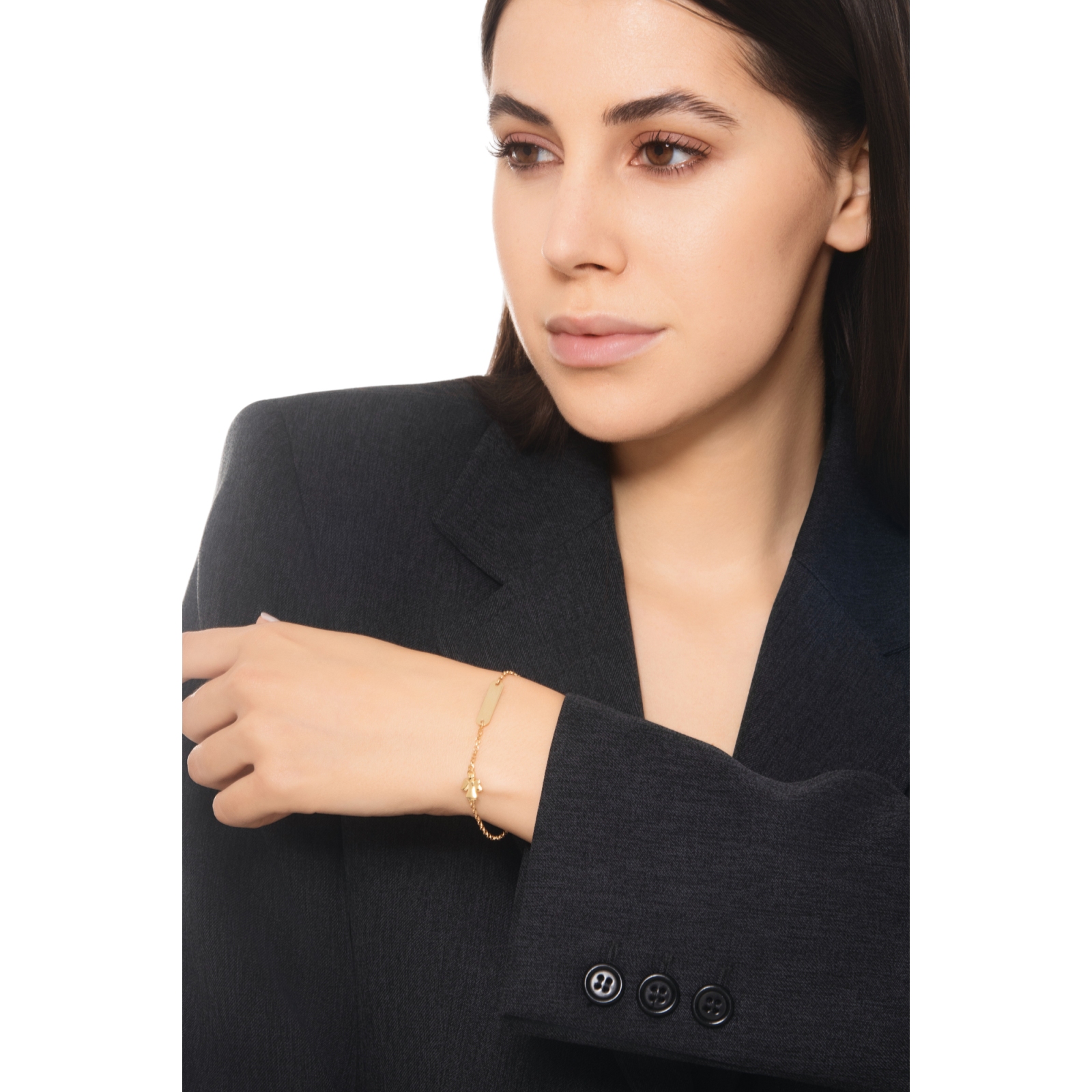 Pulsera en oro amarillo de 18 quilates con longitud ajustable de 14+2 cm, placa personalizable de 19.5x5 mm y charm de angelito; un detalle tierno y elegante perfecto para regalar en ocasiones especiales.