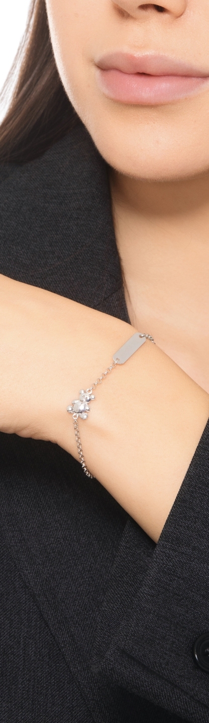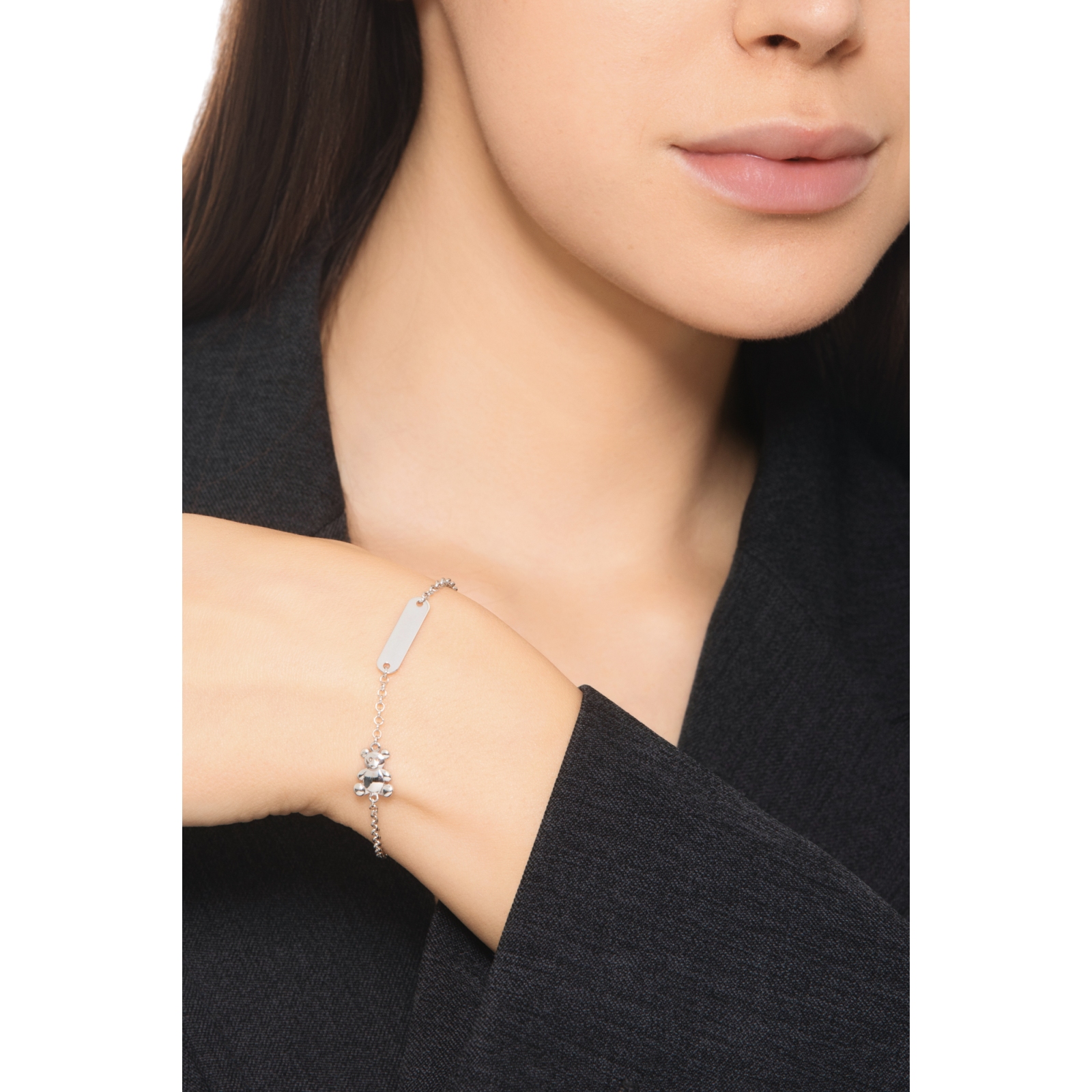 Pulsera en oro blanco 18k de longitud ajustable 14+2 cm con placa grabable y osito. La placa mide aproximadamente 20x5 mm.