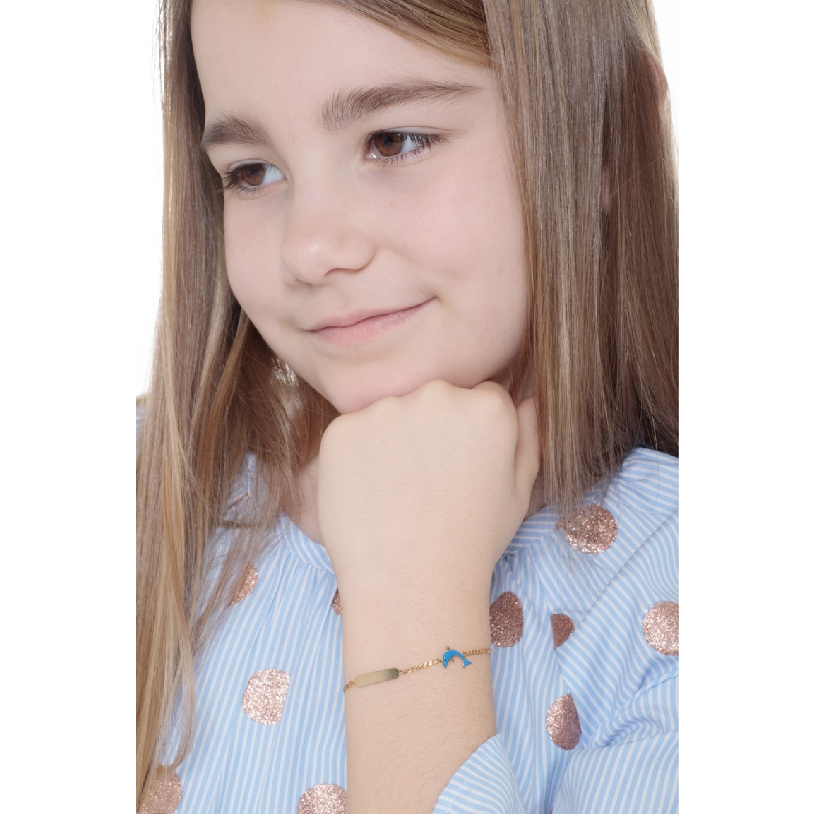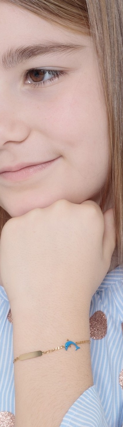 Pulsera infantil en oro amarillo 18k con placa y delfín