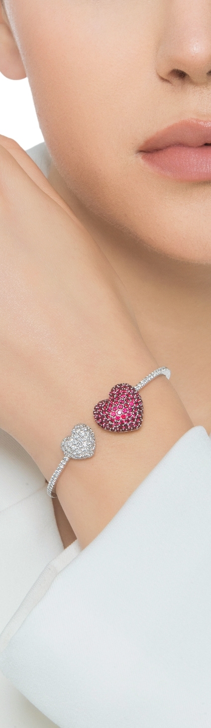 Brazalete en oro blanco 18k con dos corazones en rubíes y diamantes