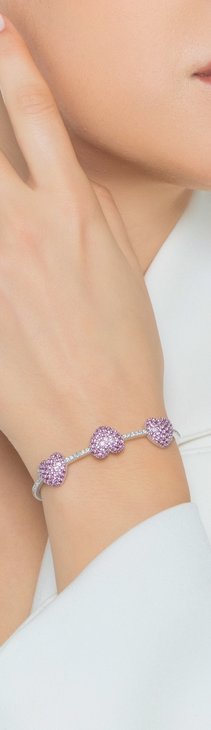 Brazalete en oro blanco 18k con tres corazones en zafiros rosas