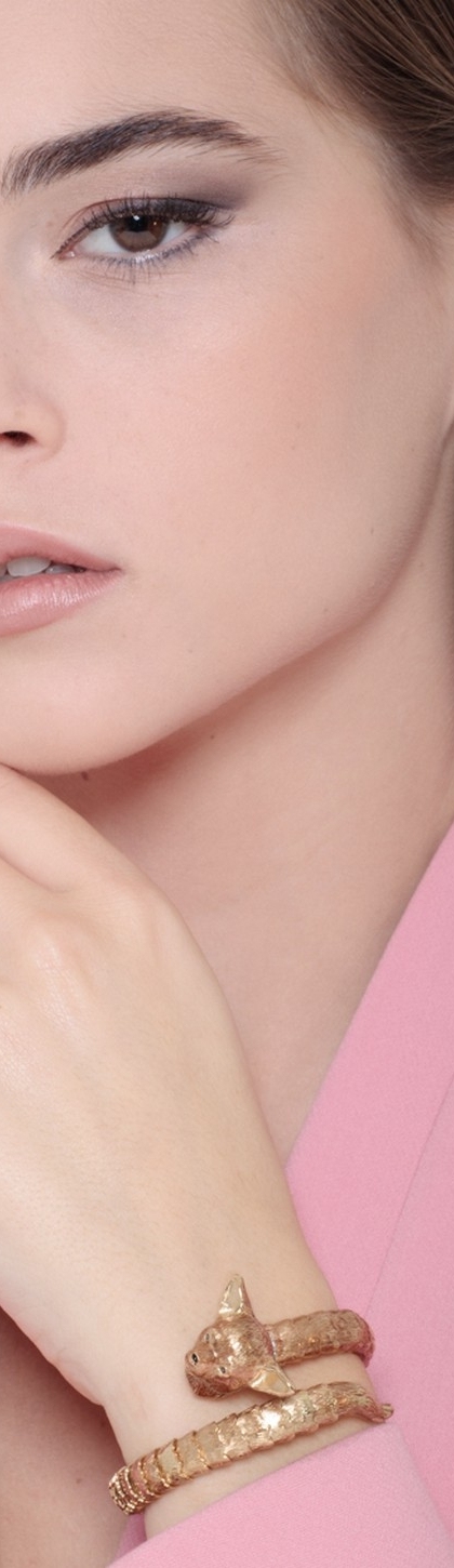 Brazalete semirrígido en oro amarillo con forma de perro y diamantes