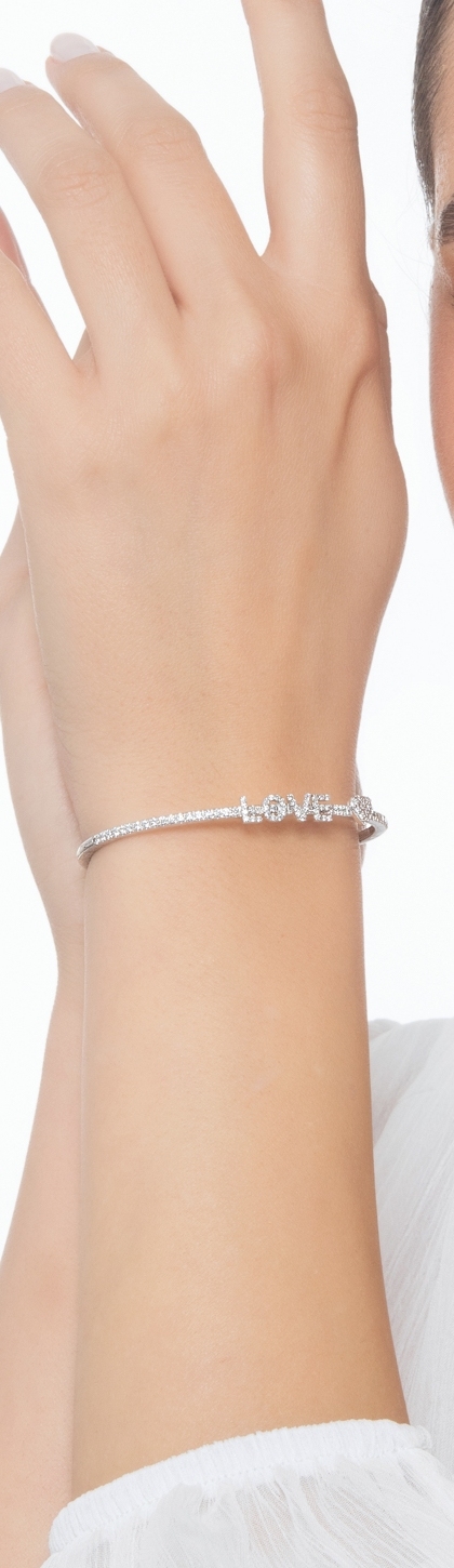 Pulsera rígida en oro blanco de 18k, personalizable, con diamantes talla brillante, color H, pureza Vs, y la inscripción LOVE.